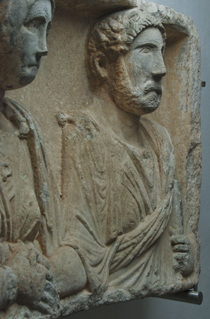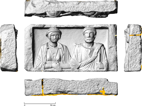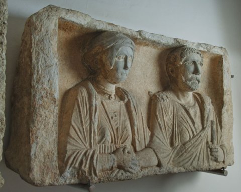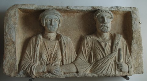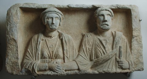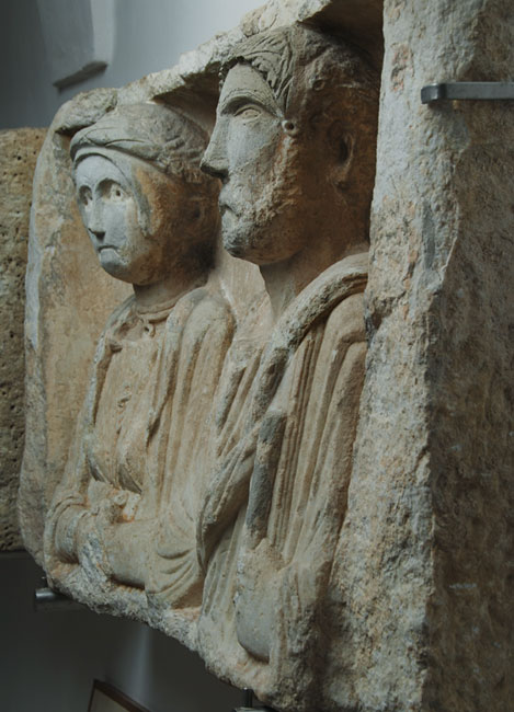 - In Rechtecknische zwei Brustbilder (Ehepaar). Links einheimische Frau: Haube, gegürtetes Gewand, Fibeln, Brosche, Umhang, zwei Halsreifen, Lunula-Anhänger, Armband. Rechts Mann: bärtig, Tunica, Toga contabulata, in der Linken Rolle (volumen).