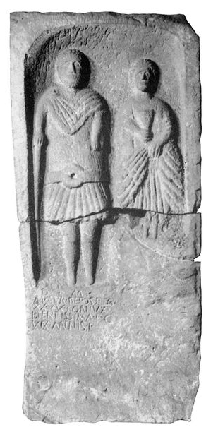 - In Bogennische zwei Ganzfiguren (Ehepaar): links stehender Mann (Soldat) mit kurzer Tunica, Gürtel mit Ringschnalle, Mantel über den Schultern, in der Rechten Stock (vitis). Rechts sitzende (?) Frau in Tunica und Mantel. Auf dem Rahmen Werkzeuge.