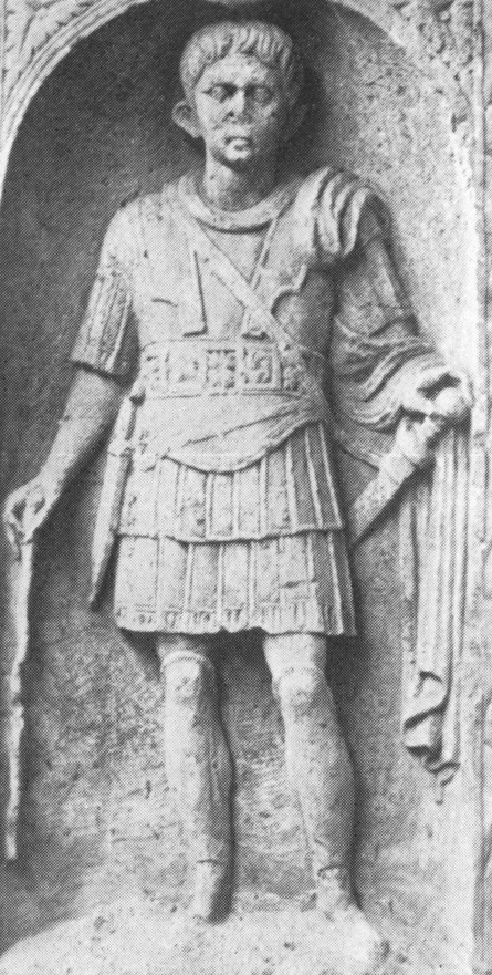 - In Bogennische stehende Ganzfigur eines bartlosen Mannes (Offizier) mit Waffen: Panzer, Schwertgurt (balteus), Beinschienen, in der Linken Schwert (gladius), in der Rechten Stock (vitis). Auf den vertikalen Rahmenleisten Rankenornament, in den Zwickeln über dem Bogen Blatt.