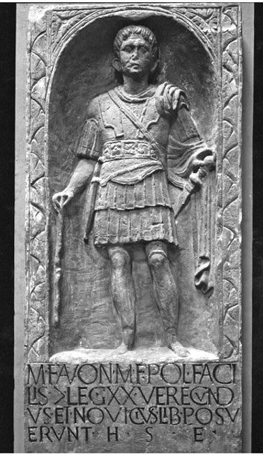 - M(arcus) Favoni(us) M(arci) f(ilius) Pol(lia) Faci/lis |(centurio) leg(ionis) XX Verecund/us et Novicius lib(erti) posu/erunt h(ic) s(itus) e(st)