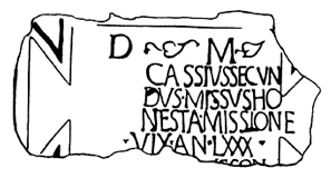 - D(is) M(anibus) / Cassius Secun/dus missus ho/nesta missione / vix(it) an(nos) LXXX / [---]us con/[---