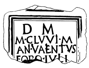 - D(is) M(anibus) / M(arcus) Cluvi(us) M(arci) / Ani(ensi) Valentius / Foro Iuli(i) / [---
