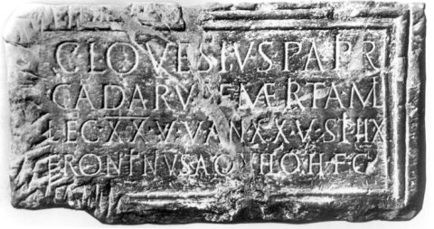 - G(aius) Lovesius Papir(ia) / Cadarus Emerita mil(es) / leg(ionis) XX V(aleriae) v(ictricis) an(norum) XXV stip(endiorum) IIX / Frontinius Aquilo h(eres) f(aciendum) c(uravit)