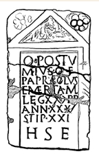 - Q(uintus) Postu/mius Q(uinti) f(ilius) / Papir(ia) [S]olus / Emerita mil(es) / leg(ionis) XX |(centuria) p(rimi) p(ili) / ann(orum) XXXV / stip(endiorum) XXI / h(ic) s(itus) e(st)