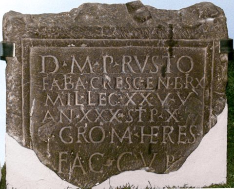 - D(is) M(anibus) P(ublio) Rustio / Fabia Crescen(ti) Brix(ia) / mil(iti) leg(ionis) XX V(aleriae) v(ictricis) / an(norum) XXX stip(endiorum) X / Groma heres / fac(iendum) cur(avit)