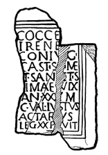 - Cocce[iae] / Iren(a)e / coniugi / castis[s]im(a)e / [e]t sanctis/[s]imae vix(it) / an(nos) XXX m(ensem) / C(aius) Val(erius) Iu[s]tus / actar[i]us / leg(ionis) XX p[os]uit