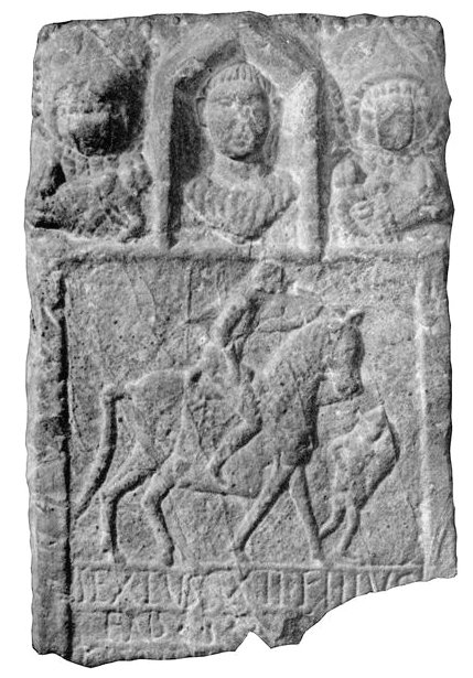 - Zwei Bildfelder übereinander. Oben bekleidete Büste eines Mannes in Giebelnische, flankiert von frontal liegenden Löwen mit Widderkopf in den Vorderpranken. Darunter Reiter (Soldat) nach rechts mit ovalem Schild in der Linken. Pferd mit Satteldecke. Vor dem Pferd Calo mit Schild.