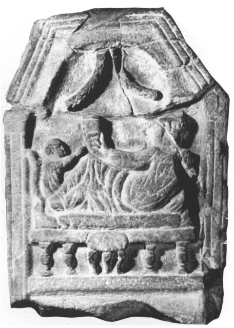 - Totenmahl: oben trapezförmiges Bildfeld mit eingetiefter Bogennische zwischen kannelierten Pilastern. Darin oben zwei Girlanden, darunter auf einer Kline gelagerte Person (Frau ?) in Ärmelgewand und Mantel, in der Rechten Becher. Bei den Füßen stehendes Kind (Diener ?) mit erhobenen Händen. Vor der Kline dreibeiniges Tischchen.