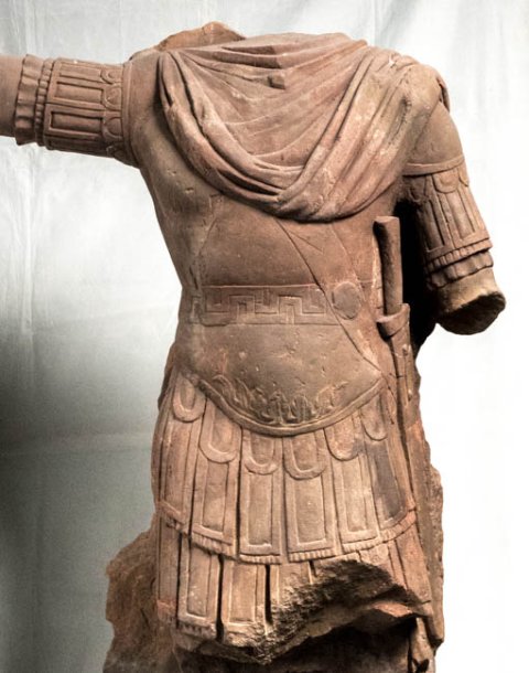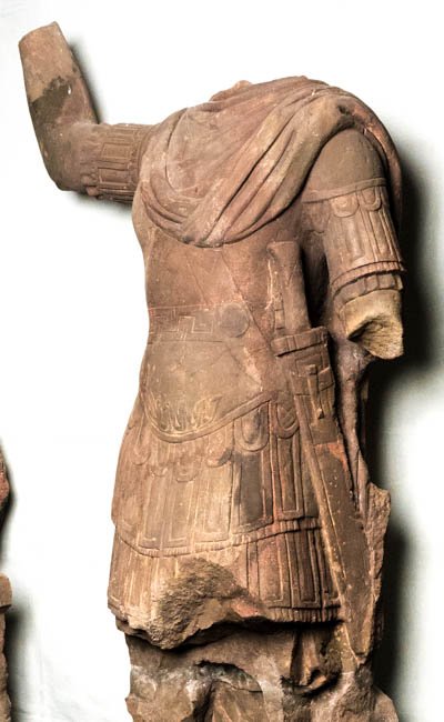 - Mythische Figur: Statue des Mars im Panzer mit Pteryges und Laschen, darüber Binde mit Mäanderornament. Um die Schultern Mantel, an der linken Seite Schwert an Schwertgurt (balteus). Beinschienen, Sandalen. Rechter Arm erhoben, hinter dem linken Bein Rest eines Schildes, Fragment des Helmbusches mitgefunden. Teil einer Dreigötter-Gruppe (siehe Nr. 14946, 14947).