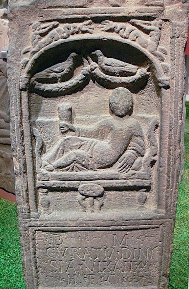 - Totenmahl: Gerahmtes Bildfeld, darin gerahmte Bogennische mit Pilastern. In den Zwickeln über dem Bogen Seewesen (zwei Tritone mit Muschelhorn). Unter dem Bogen zwei Vögel auf Girlanden, darunter auf Kline (mit hoher Lerhne und gedrechselten Beinen) gelagerte Frau in Ärmelgewand und Mantel, in der Rechten Becher. Vor der Kline dreibeiniges Tischchen. Schriftfeld profiliert gerahmt.