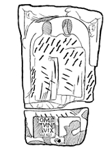 - Zwei frontal stehende Ganzfiguren (Ehepaar) in Bogennische. Mann in halblanger Tunica und Mantel. In den Zwickeln über dem Bogen Rosette. Auf der linken Nebenseite Werkzeug (Spitzhacke, Meißel, Hammer, Lot).