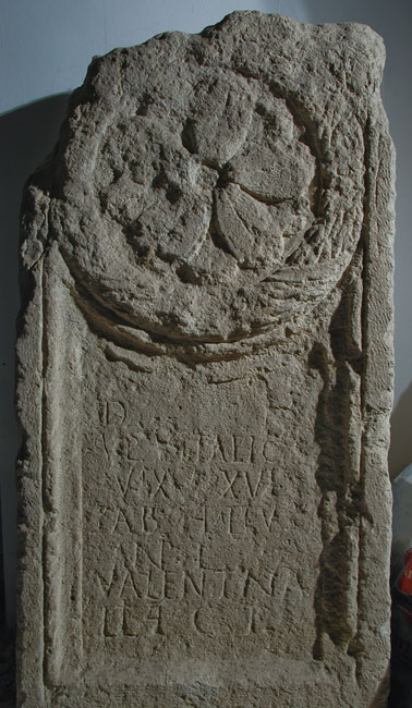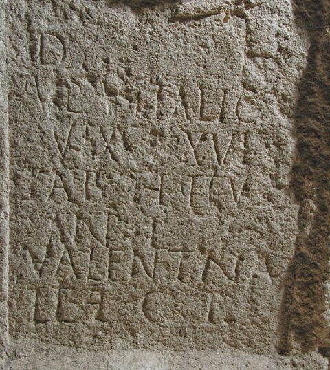 - D(is) M(anibus) / Ulp(ius) Vitalio / vix(it) an(nis) XVI[I?] / Fab(ius) Hatius / an(norum) L[---]X / Valentina / tit(u)l(um) fecet(!) [---