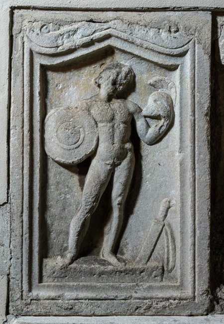 - Mythische Figur (Mars, Heros ?). In Giebelnische auf flachem Podest nackter Jüngling mit Waffen: in der Rechten Rundschild, in der Linken Helm mit Helmbusch, neben dem linken Fuß Schwert mit Schwertgurt (Balteus).