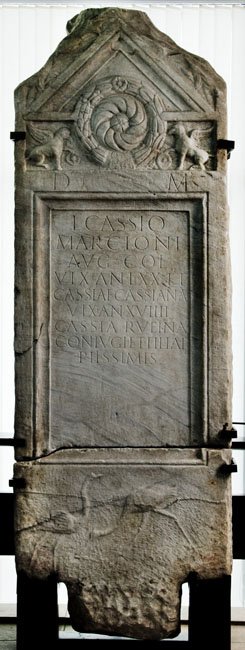 - D(is) M(anibus) / L(ucio) Cassio / Marcioni / Aug(ustali) col(oniae) / vix(it) an(nos) LXX et / Cassiae Cassianae / vix(it) an(nos) XVIIII / Cassia Rufina / coniugi et filiae / piissimis