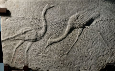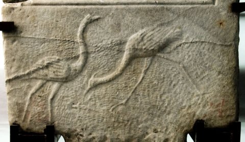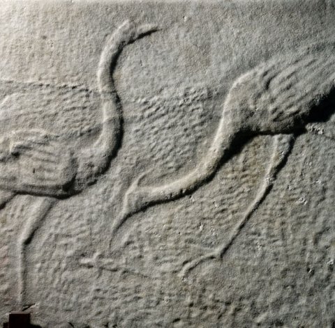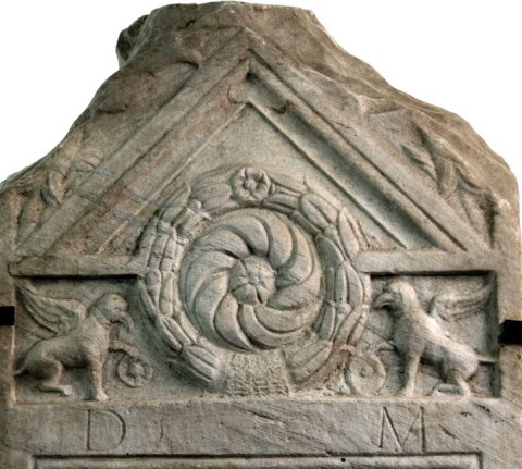 - Gerahmter Giebel, auf den Giebelschrägen Reliefreste. Untere Rahmenleiste des Giebels von Kranz mit Wirbelrosette darin überschnitten, der von zwei hockenden Greifen flankiert wird. Schriftfeld profiliert gerahmt, ungerahmtes Sockelbild mit zwei Reihern.