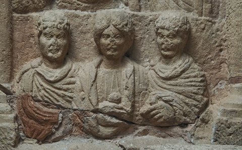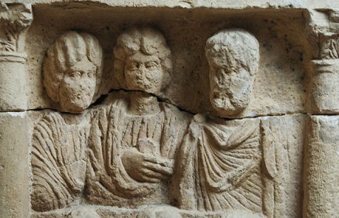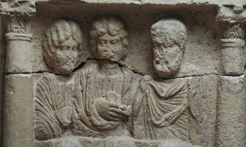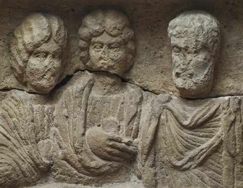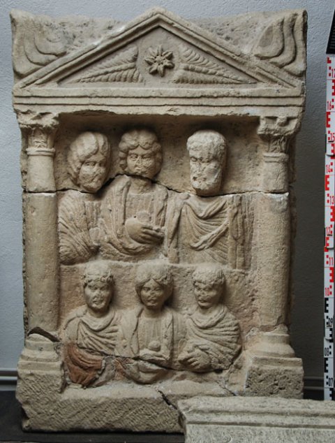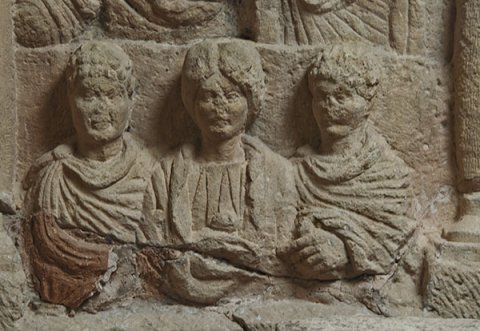 - Giebel mit Akroteren und Rosette zwischen Blättern. Zwischen Säulen Halbfiguren einer Familie in zwei Registern. Oben zwei Frauen in Tunica und Mantel und ein bärtiger Mann im Sagum, unten drei Kinder (Mädchen mit Apfel zwischen zwei Knaben im Sagum).