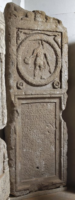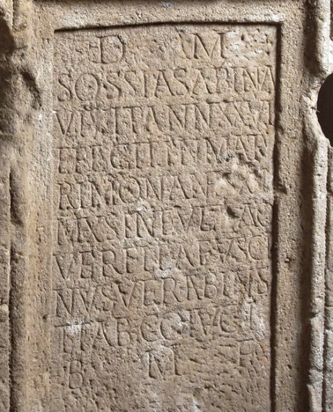 - D(is) M(anibus) / Sossia Sabina / vixit ann(os) XXVI / e(t) fecit in mat/rimon(io) ann(os) XI / m(enses) X sine ulla q/uerella Fusci/nus ver(na) ab ins/t(rumentis) tab(ularii) coniugi / b(ene) m(erenti) f(ecit)
