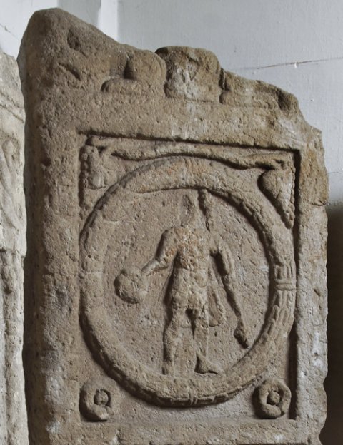 - Aufsatz mit Ciste zwischen liegenden Löwen. Rechteckiges Bildfeld, darin Medaillon mit stehender Figur (Mann ?), die in der Rechten einen Kranz, in der Linken Stab (Thyrsos ?) hält. In den Ecken des Bildfeldes Weinranken und Rosetten.