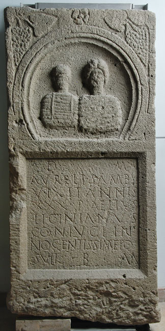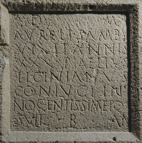 - D(is) M(anibus) / Aureli(a) Sambu(ca?) / vixit annis / XXX P(ublius) Aelius / Licinianus / coniugi in/nocentissimae po/suit b(ene) m(erenti)