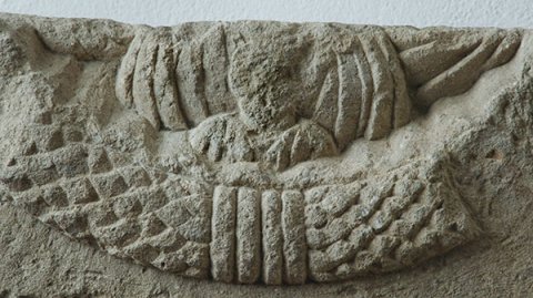 - Unterer Teil eines Medaillons mit Kranzrahmen, darin Brustbild einer Frau, vor ihr Büste eine Kleinkindes.