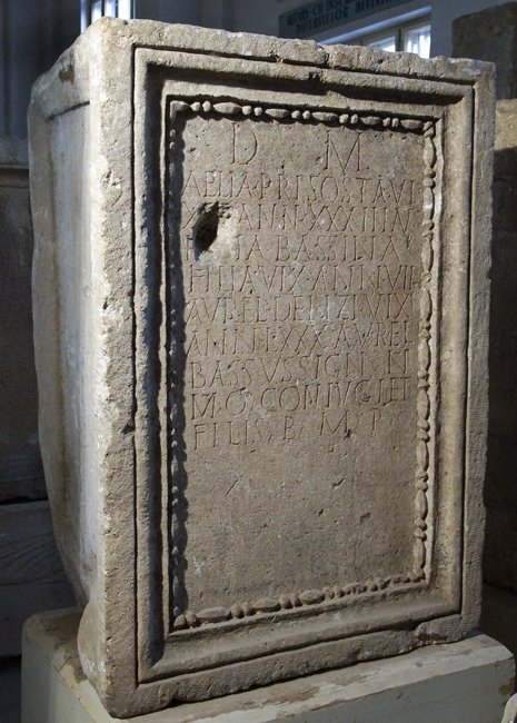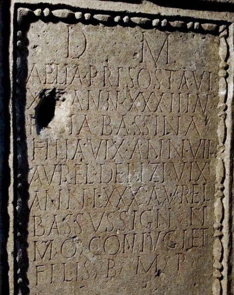 - D(is) M(anibus) / Aelia Prisosta vi/x[it] ann(os) XXXIII Au/r[el]ia Bassina / filia vix(it) ann(os) VII / Aurel(ius) Denzi vix(it) / ann(os) LXXX Aurel(ius) / Bassus sign(ifer) n(umeri) / M(aurorum?) O(ptatiensium?) coniugi et / fili(i)s b(ene) m(erentibus) p(osuit)