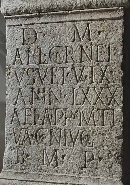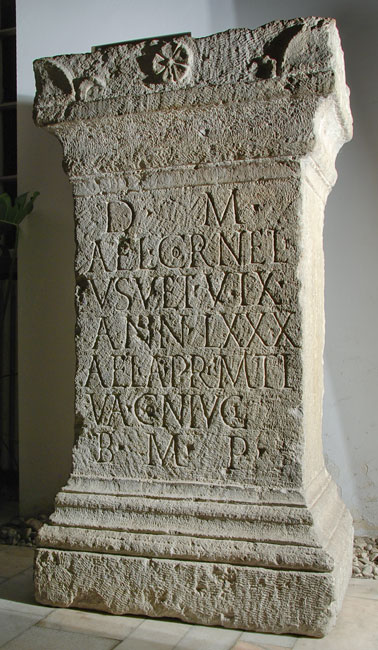 - D(is) M(anibus) / Ael(ius) Corneli/us vet(eranus) vix(it) / ann(os) LXXX / Aelia Primiti/va coniugi / b(ene) m(erenti) p(osuit)