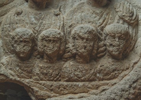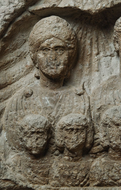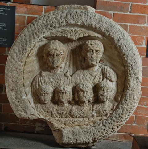 - Medaillon mit Kranzrahmen und Muschelnische. Darin Brustbilder einer Familie: Ehepaar (Frau mit antoninischer Frisur, Ohrgehängen, Fibeln. Bärtiger Mann in Toga ?) und vier Kinder (zwei Knaben, zwei Mädchen).