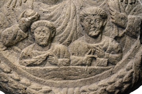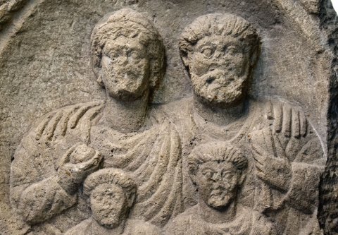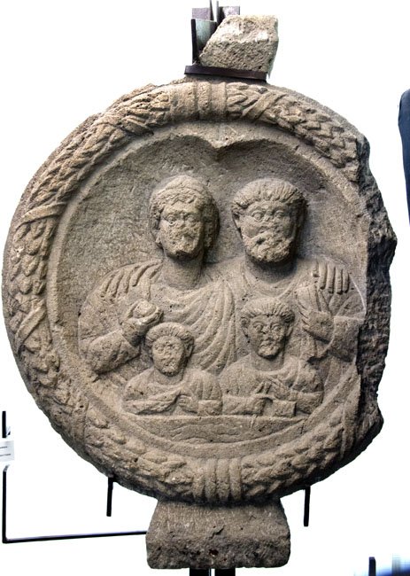 - Medaillon mit Kranzrahmen mit Tänien, Muschelnische mit Brustbildern einer Familie: links Frau in Ärmelgewand und Mantel, in der Rechten Frucht, rechts bärtiger Mann in Ärmeltunica, in der Linken Rolle (volumen). Vorn zwei Kinder (Knaben), das linke mit Vogel, das rechte mit Stilus und Schreibtafel.