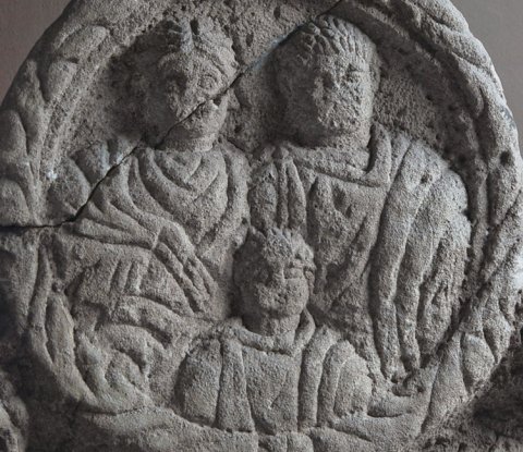 - Auf zwei liegenden Löwen Medaillon mit Kranzrahmen und Pinienzapfen-Aufsatz. Brustbilder einer Familie: links Frau im Mantel, rechts Mann im Sagum, vorn Kind (Knabe im Sagum).