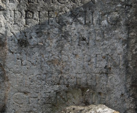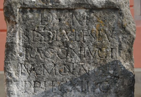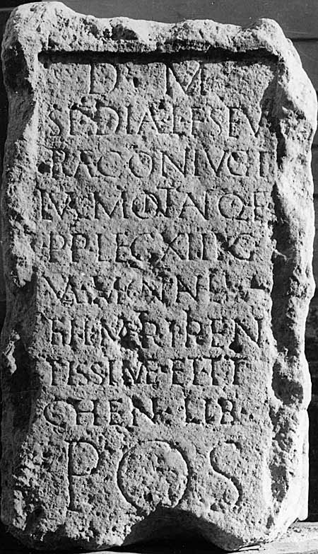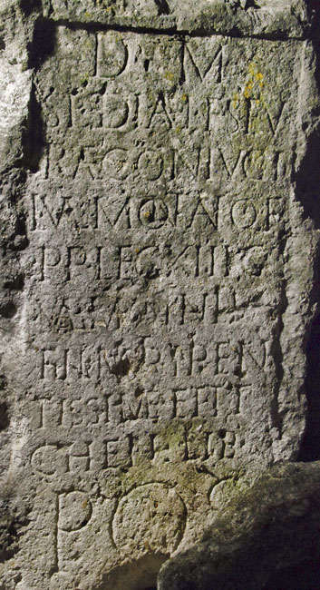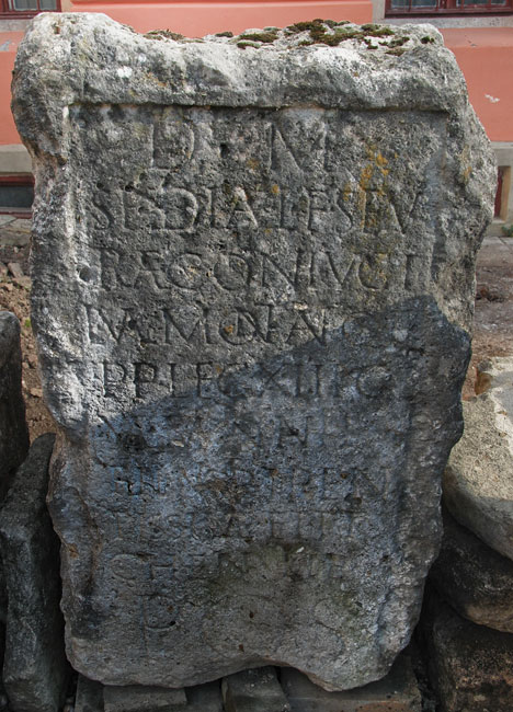 - D(is) M(anibus) / Spediae L(uci) f(iliae) Sev/erae coniugi / L(uci) Val(eri) Montan(i) Q(uinti) f(ili) / p(rimi) p(ili) leg(ionis) XIII G(eminae) / Val(eria) Montanilla / fil(ia) matri pien/tissim(a)e et Ty/chen(i) lib(ertae) pos(uit)