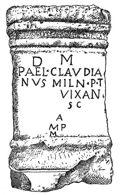- D(is) M(anibus) / P(ublius) Ael(ius) Claudia/nus mil(es) n(umeri) P(almyrenorum) T(ibiscensium) / [---] vix(it) an(nos) / [---]SC[---] / [---]A[---] / [---]MP[---] / [---]M[---