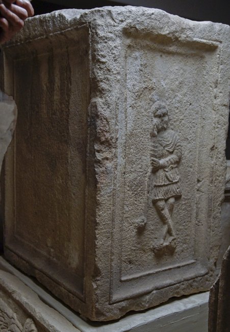 - Mythische Figur: auf den Nebenseiten Mann (Attis ?) mit Pedum. Schriftfeld gerahmt.