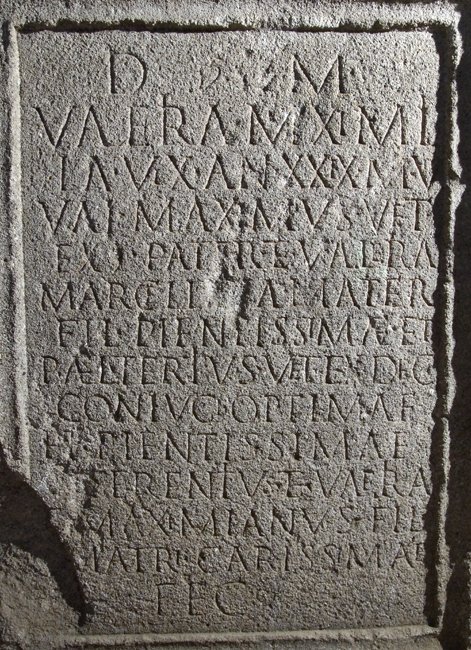 - D(is) M(anibus) / Valeria Maximil/la vix(it) an(nos) XXIX m(enses) VI Valerius Maximus vet(eranus) / ex [centurione] pater et Valeria / Marcellina mater / fil(iae) pientissimae et / P(ublius) Ael(ius) Tertius ex dec(urione) / coniugi optimae / et pie[n]tissimae / et Terentius et Valeria / [et] Maximianus fil(ii) matri carissimae / fec(erunt)
