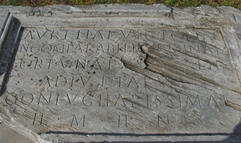 - D(is) M(anibus) // Aureliae Victoriae / incomparabili feminae / Fortunatus Aug(usti) lib(ertus) / adiut(or) tabular(ii) / coniugi karissimae / h(oc) m(onumentum) h(eredem) n(on) s(equetur)