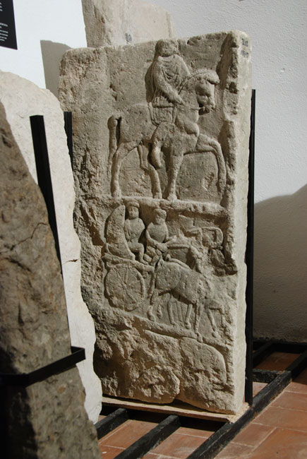 - Rechte Seitenwange: auf der Außenseite zwei Kämpfer mit eckigen Schilden (Gladiatoren ?). Auf der Innenseite oben Reiter, unten Wagenszene (zweirädriger Wagen mit Zweigespann und Verdeck, davor zwei Personen).