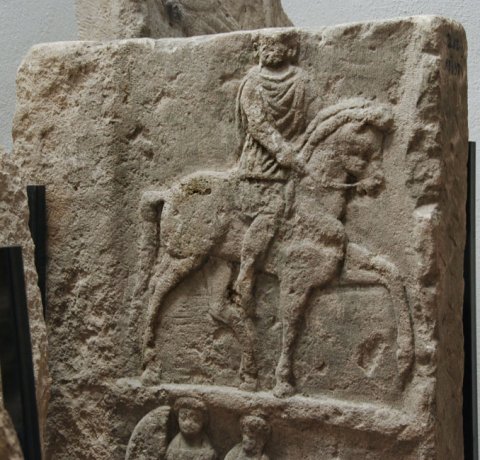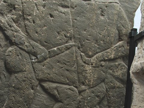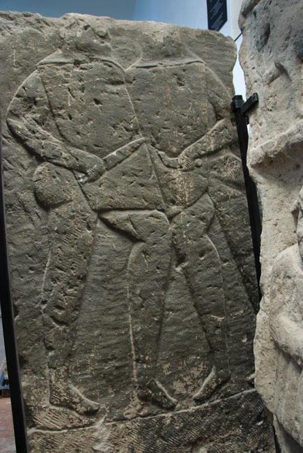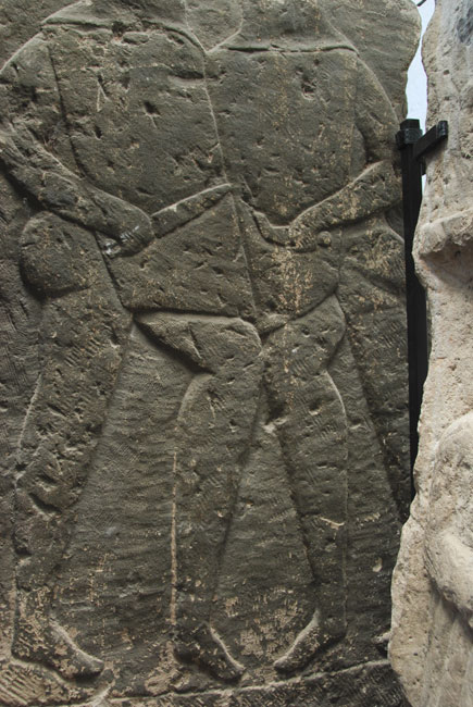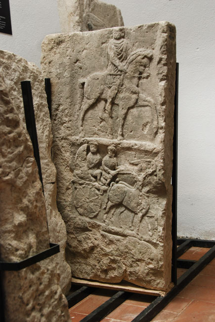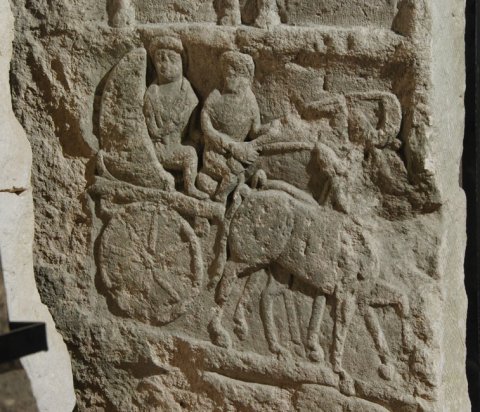 15082 Wand mit Reliefs auf beiden Seiten (Kämpfer, Reiter, Wagenszene)