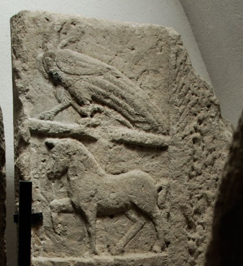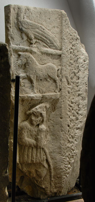 - Linke Seitenwange. Drei Bildfelder übereinander: oben Pfau, in der Mitte Pferd, unten Attis mit Pedum.