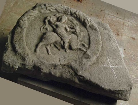 - Fragment einer trapezförmigen Aedicula-Decke (?). Mythos: Europa auf dem Stier in Kranzrahmen mit Rosette.