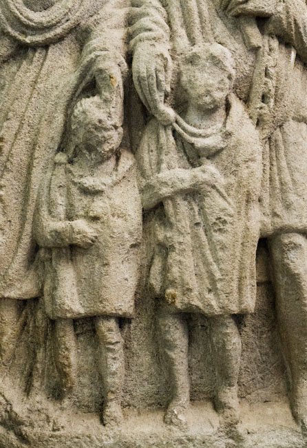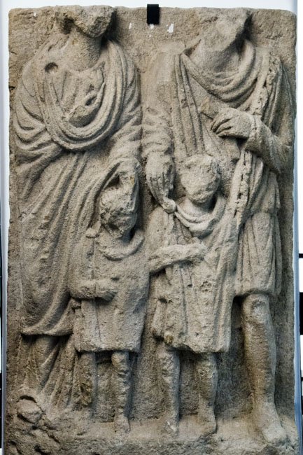 - Rückwand einer Aedicula. Stehende Ganzfiguren einer Familie. Links Frau in Mantel und Tunica, rechts Mann in kurzer Tunica und Sagum mit Fransensaum, in der Linken Rolle (volumen). Vorn zwei Kinder (Knaben im Sagum).