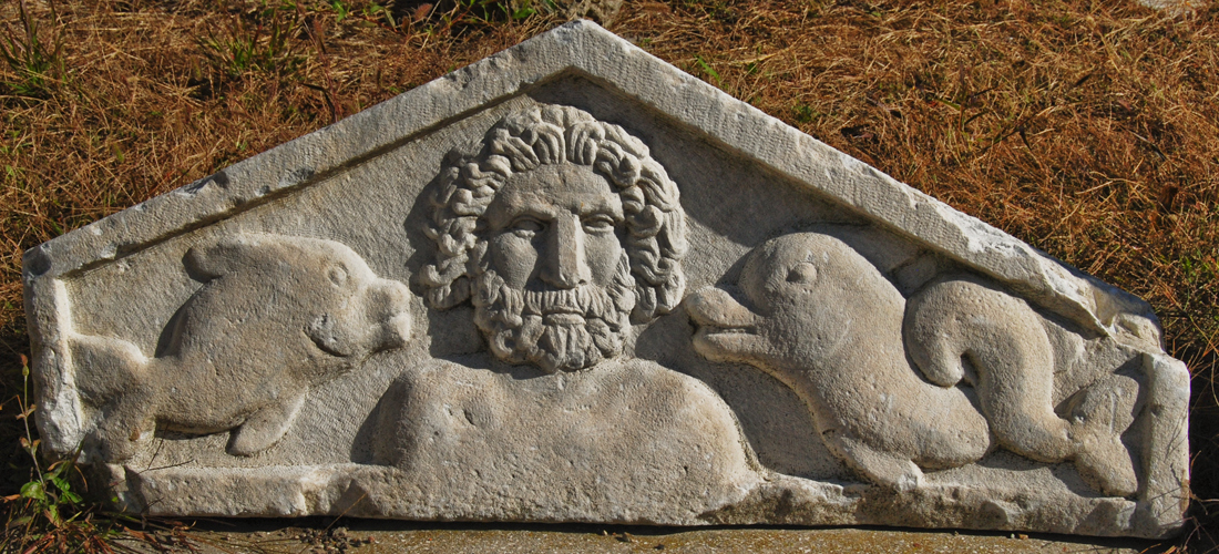15094 Giebel mit bärtiger Büste zwischen Fisch und Delphin