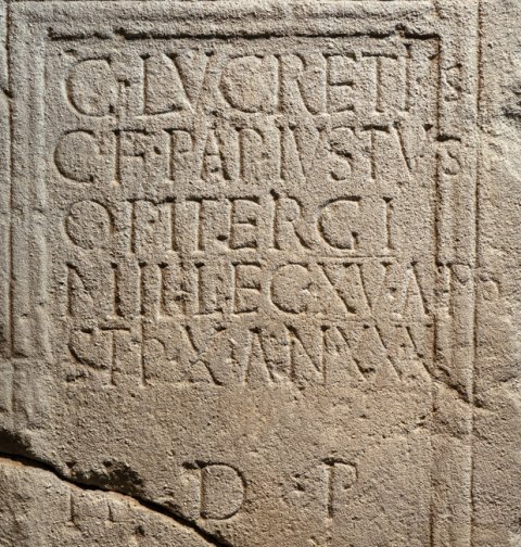 - C(aius) Lucretius / C(ai) f(ilius) Pap(iria) Iustus / Opitergi(o) / mil(es) leg(ionis) XV Apo(llinaris) / st(ipendiorum) X an(norum) XXX / h(eres) d(e) p(ropio)