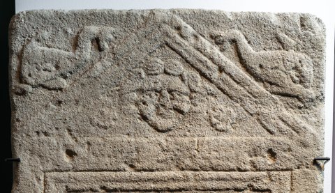 - Eingeschriebener Giebel mit Gorgoneion zwischen Rosetten, auf den Schrägen Delphine.
