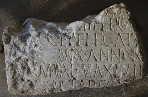 - ---]VA[---] / [---] mil(es) leg(ionis) X[III g(eminae) ex]/cept(or) legati [Aug(usti)] / vix(it) ann(os) XX[---] / M(arcus) Val(erius) Max[i]min[us --] / actar(ius) coh(ortis) [---] / [---