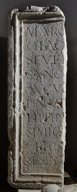 - Marc[iae] / Otac[iliae] / Sever[ae] / sanct[iss(imae)] / Augus[tae] / d(ominae) n(ostrae) mat[ri Phi]/lippi n[obilis]/simi Ca[esar(is)] / et ca[str(orum)] / res p(ublica) col(oniae) [Nap(ocensis)]