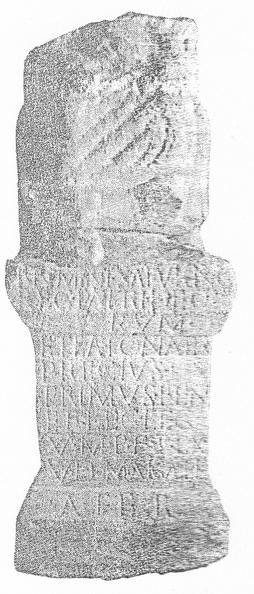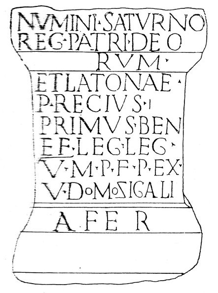 - Numini Saturno / reg(i) patri deo/rum // et Latonae / P(ublius) R(a)ecius / Primus ben/ef(iciarius) leg(ati) leg(ionis) / V M(acedonicae) p(iae) f(idelis) p(osuit) ex / v(oto) domo Zigali // Afer