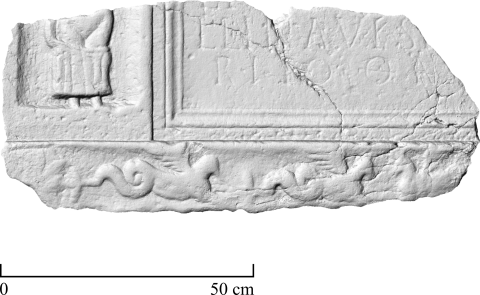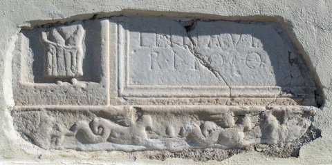 - Mythische Figur (Venus ?), Meerwesen: im linken Seitenfeld der Inschrift stehende Frau, Körper entblößt, Gewand um die Beine. Unten Fries mit Seegreifen.