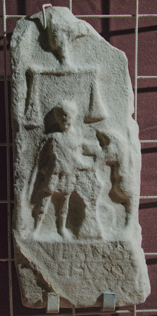 - Mythische Figur: von Nemesis nur rechte Hand mit Waage erhalten, darunter Mann in kurzer Tunica, der an einem Altar opfert. Rechts Vorderteil eines Greifs. Votivinschrift auf der Sockelleiste.