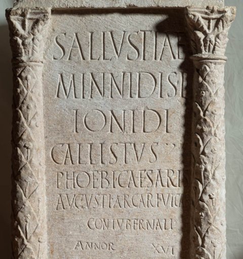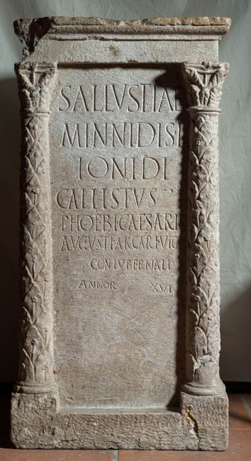 - Sallustiae / Minnidis l(ibertae) / Ionidi / Callistus / Phoebi Caesaris / Augusti arcari(i) vicar(ius) / contubernali / annor(um) XVI