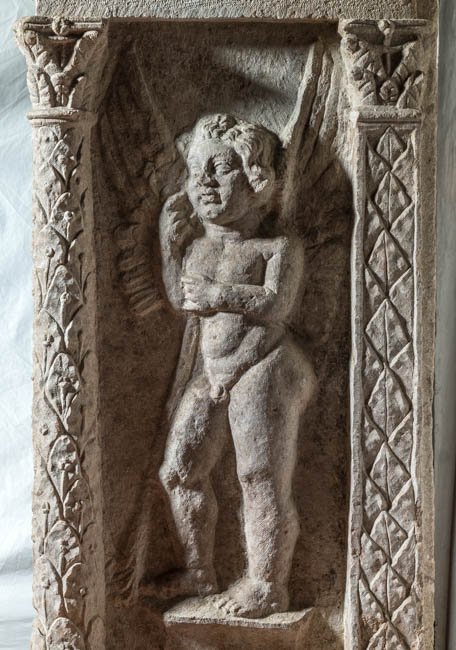 - Inschrift zwischen Säulen mit Lorbeerblättern, auf den Nebenseiten Trauergenius mit gesenkter Fackel, an den Ecken zur Rückseite Lorbeerpilaster.