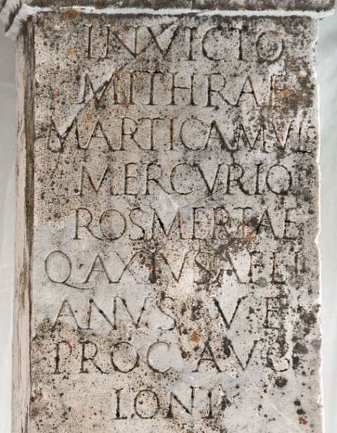 - Invicto / Mithrae / Marti Camulo / Mercurio / Rosmertae / Q(uintus) Axius Aeli/anus v(ir) e(gregius) / proc(urator) Aug[[g(ustorum)]] / Ioni